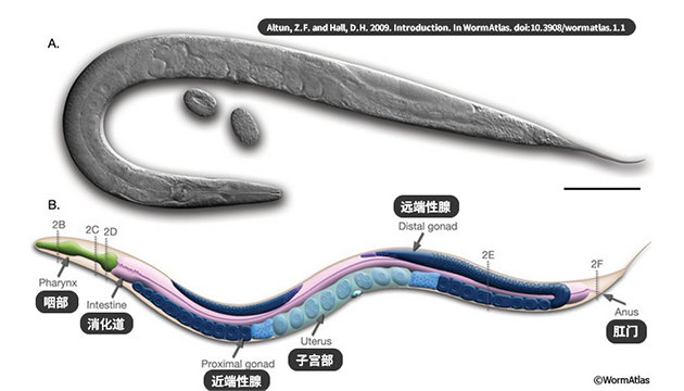 線蟲是一類無(wú)體節(jié)的無(wú)脊椎多細(xì)胞生物,絕大多數(shù)是線狀的蠕蟲,其中秀麗線蟲在生物研究中起著重要作用,是第一個(gè)完成基因測(cè)序的動(dòng)物,約20000個(gè)基因中有40%和人類的基因具有同源性,同時(shí)秀麗線蟲生命周期短,繁殖量大,還具備完備的發(fā)育和解剖學(xué)特征、復(fù)雜的遺傳學(xué)特征,是生物學(xué)研究的重要模式動(dòng)物。