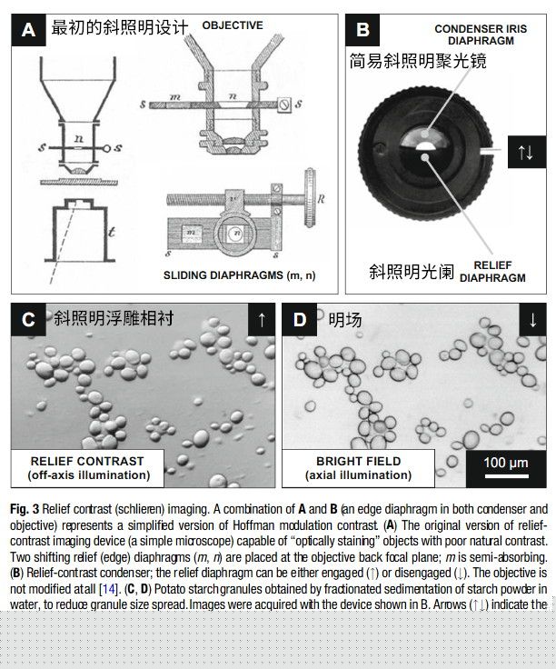 斜照明(Oblique Illumination)技術(shù)又稱離軸照明(Off-Axis Illumination),是一種非常古老的顯微鏡技術(shù),1866年由德國(guó)物理學(xué)家August Toepler提出③,并由阿貝聚光鏡的發(fā)明者Ernst Abbe完善,基本思路是利用偏軸光照射樣品,然后經(jīng)過透明樣品發(fā)生衍射、反射和折射,最終除了未衍射的0級(jí)光,還能把一兩個(gè)臨近級(jí)別的衍射光(1級(jí)和-1級(jí))用到成像中,從而提升分辨率和焦深,形成浮雕樣式的立體成像,因此這種觀察方式又稱浮雕相襯(Relief Contrast,簡(jiǎn)稱RC)。