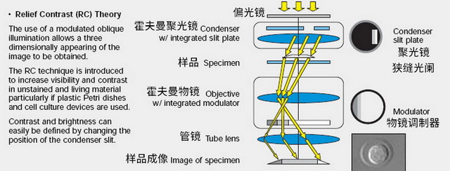 霍夫曼調(diào)制相襯在斜照明基礎(chǔ)上加入了三個(gè)部件,偏振鏡,狹縫聚光鏡和物鏡調(diào)制器,使部分衍射光的強(qiáng)度大于背景光,部分衍射光的強(qiáng)度小于背景光,這樣就形成更高對(duì)比度的立體成像。