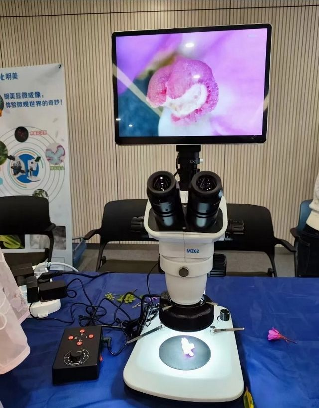活動現(xiàn)場,Mshot明美精心準備了兩款一體式數碼顯微鏡,分別由體視顯微鏡MZ62、生物顯微鏡ML11搭配一體式平板相機MD28-A組成,不僅可以從目鏡觀察,還能在平板屏幕上同步顯示鏡下圖像,新奇體驗不僅讓孩子們能夠親身感受科技的魅力,更在游玩中學習了科學知識,探索了神秘的微觀世界。