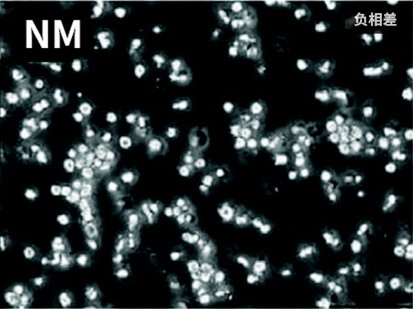 相襯觀察還有正負和對比度高低之分,常見的相襯是正相襯,背景是亮色的,樣品被高亮光環(huán)包圍。而負相襯背景呈暗色,類似暗場,樣品主體會呈高亮。負相差物鏡有高對比(NH)和中對比度(NM)區(qū)別,會標記在物鏡上。