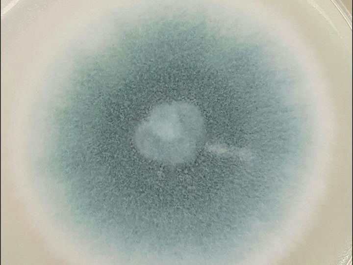 培養(yǎng)皿中看到,菌落生長較快,結(jié)構(gòu)疏松,表面灰綠色,背面無色或略呈褐色。