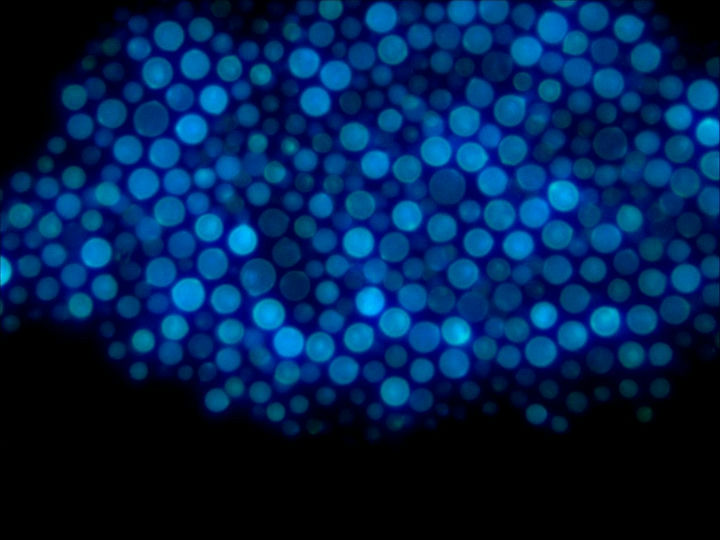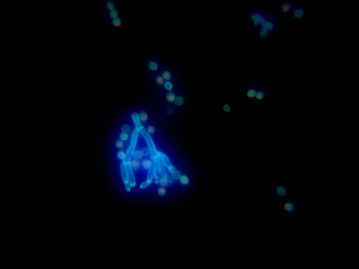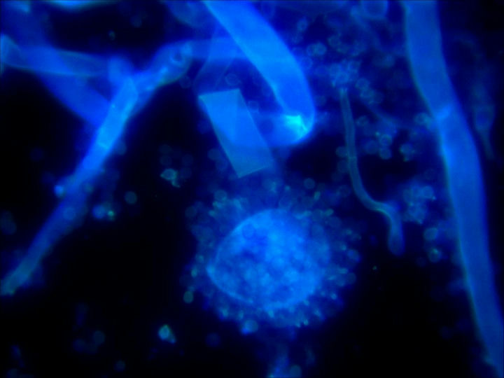 在熒光顯微鏡下,可見“雙異型的45度分支”,菌絲較大,菌體有許多復(fù)雜的分枝菌絲構(gòu)成,紫外激發(fā)下有藍(lán)色和綠色熒光。