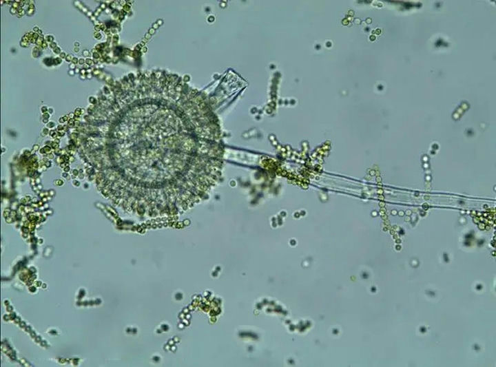 在生物顯微鏡下,分生孢子為球形,菌絲發(fā)達(dá),有隔膜和多分枝,頂部形成球形頂囊