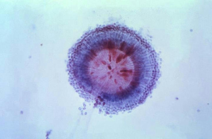 在生物顯微鏡明場觀察,呈球形或橄欖球形,菌體直徑4-20um,莢膜寬3-5um,不易染色。